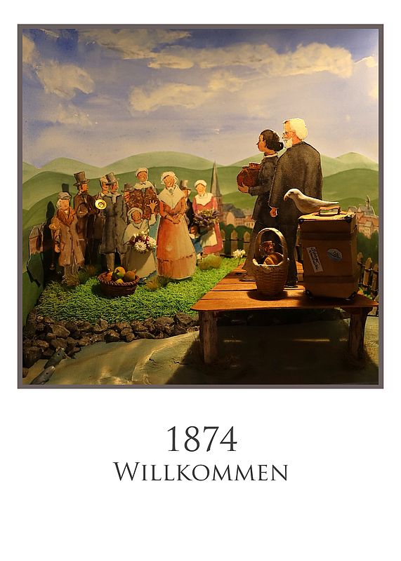 Die Brüdergemeine Neuwied war keine in sich geschlossene Gemeinde, sondern unterhielt zahlreiche Kontakte in der Stadt, in der Umgebung und weltweit. Die Szene zeigt die Ankunft des Ehepaars Siebörger in Neuwied nach ihrer Rückkehr von Nicaragua.